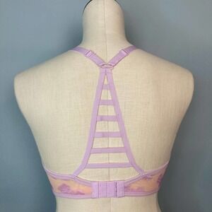 PINK Victoria's Secret Purple Beige Lightly Lined Hibiscus Flower Underwire Bra 34DD Ladder Cage Back. Nude, beige and lavender purple lace floral underwire bra. Lightly Lined bra. Cage, ladder back racerback style bra. Adjustable straps. Pull over style with hook and eye closure in back. In great, pre-owned condition. Cage back, Ladder back, Racerback, Underwire, Hibiscus Flower, Lace, Lightly Lined.