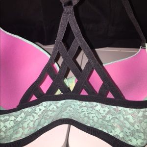 Mint green lace Racerback bra. Used. Some discoloration around underwire. 32D
