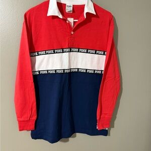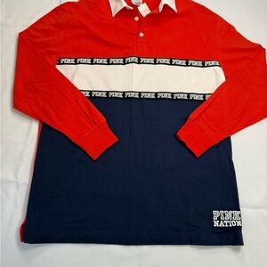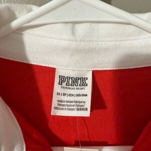 This stylish button down shirt from PINK Victoria's Secret features a vibrant red and white color scheme. The top section is bright red, complemented by a contrasting white collar and a wide white band across the chest. Perfect for adding a pop of color to any casual outfit.