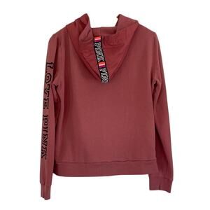 Pretty Rose/Mauve Pink hoodie with "Love Pink" logo on one sleeve and a stripe of PINK logo ribbon on hood.