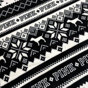 Cozy up in style with this PINK by Victoria’s Secret Sherpa-lined throw blanket. Features a classic white and black Fair Isle print on the front with ultra-soft sherpa fleece backing. Generously sized at 50x60 inches—perfect for lounging, dorm rooms, or adding a festive pop to your bedding. Great gift or collectible VS piece!