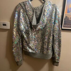 Elevate your style with this dazzling bomber jacket from PINK Victoria's Secret, featuring a shimmering silver and gray sequin design. The jacket's ribbed cuffs and waistband provide a comfortable fit, while the reflective sequins create a captivating holographic effect. Perfect for making a statement, this jacket is a must-have for any fashion-forward wardrobe.