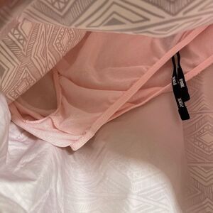 Brand new with tags, super pretty and hard to find. Light pink color with a metallic silver pattern over it, silver sequin bling logos down each side of the shorts. No flaws at all. Size small. True to size. They have a drawstring waist built in panties lining with small pocket.
