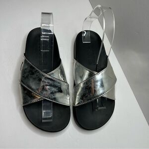 These sandals feature a sleek open-toe design with two wide metallic silver straps that add a touch of elegance. The black footbed provides a striking contrast, while the transparent slingback strap ensures a secure fit. Perfect for both casual and dressy occasions, these sandals offer comfort and style.