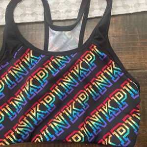 Lot of two PINK sports bras, red and orange tie dye with PINK logo band and black and rainbow logo print