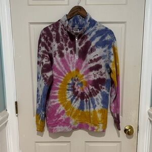 PINK by Victoria’s Secret tie dye quarter zip pullover. This sweatshirt is in great used condition and an oversized fit. It has hand pockets and is a size XS. P2P measurement is 21”.