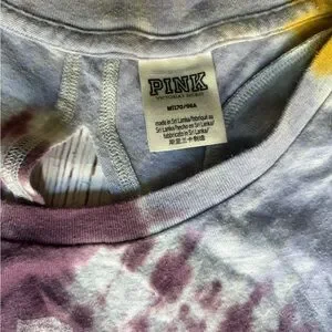 Vibrant tie-dye tank with purple, yellow, and white. Solid yellow tank with 'pink' logo.