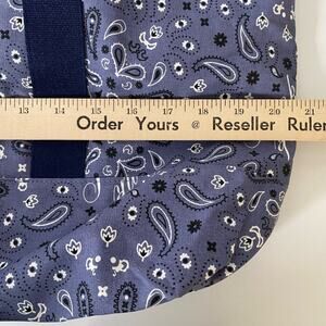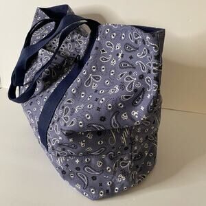 Spacious tote bag featuring a stylish blue bandana print. This eye-catching tote is designed with sturdy navy blue straps, offering both comfort and durability for everyday use. The bag's generous interior makes it ideal for carrying essentials, while the unique bandana pattern adds a touch of flair to any outfit. Perfect for a day at the beach, a weekend getaway, or simply running errands around town.