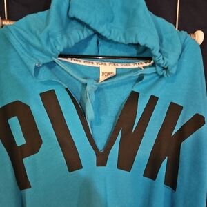 vs pink v neck slit design. Bold black lettering. Soft and comfortable fabric. little over sized. loved this light weight pullover. wore it in layers in fall or work it over a swimsuit at the beach all day in summer. good condition, has been worn, still comfortable, no rips stains tears, no cracking in letters