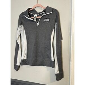 Elevated activewear defines this PINK Victoria's Secret Ultimate pullover, a versatile piece designed for both performance and style. The sleek gray body is accented by crisp white panels along the sides, creating a sporty, modern look. A quarter-zip neckline allows for adjustable comfort, while the iconic PINK logo is subtly displayed on the chest. The branded taping inside the collar adds a signature touch. This pullover is perfect for a morning jog, a casual gym session, or simply lounging in comfort on a cool day.