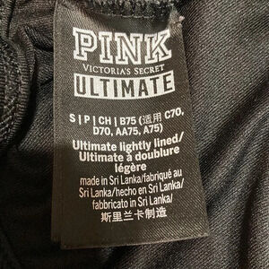 VS PINK Ultimate lightly lined black sports bra in size S. Like new condition, 88% polyester, 12% elastane. Solid black with gray PINK logo on the back, removable pads. Please see photos for approximate measurements and details. Excellent condition from smoke free and pet free home.