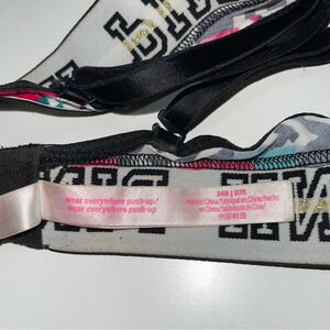 PINK Victoria’s Secret Wear Everywhere Push-up bra. In excellent condition! Push-up style. Padded & underwire. Adjustable straps. Hook & eye back closure. Black band with white icon & gold stripe. Black & white icon print with bright red roses. Size 34B.