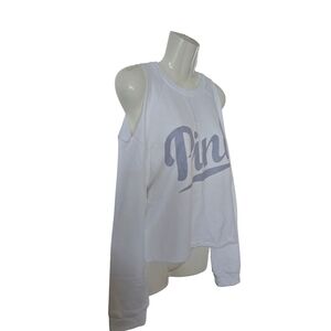 Stylish white cold shoulder top with a bold 'Pink' logo. Perfect for casual outings.