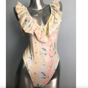 PINK Victoria's Secret White Shine Floral Ruffle Deep V One Piece Swim Suit S