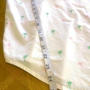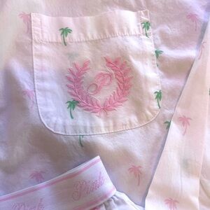 Cozy white pajama set with pink palm tree print. Button-up top and matching shorts. Perfect for lounging.