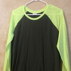 Worn a handful of times, still in great condition with no stains or signs of wear. Size L, true to size. Olive green and neon yellow in color. Baseball style tee, 3/4 sleeve.