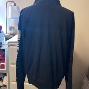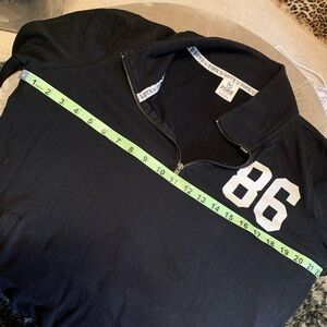 This is one of my absolute favorite sweatshirts but I just have to clear some out. Victoria’s Secret pink brand black kangaroo pocket quarter zip sweatshirt. It is well broken in and well loved but still looks great and has tons of life left in it. Features the logo on the front and the sleeve and the pink dog at the side of the bottom front. Just a great comfortable sweatshirt for year-round use.