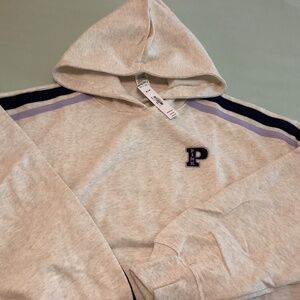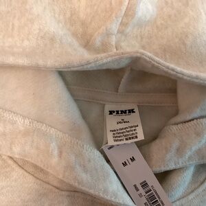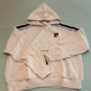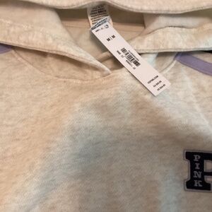PINK Victoria’s Secret hoodie, new with tags. Size medium. 24” pit to pit. It’s a cream grey color. Light fleece. Looks like stripe is really dark blue and light purple.