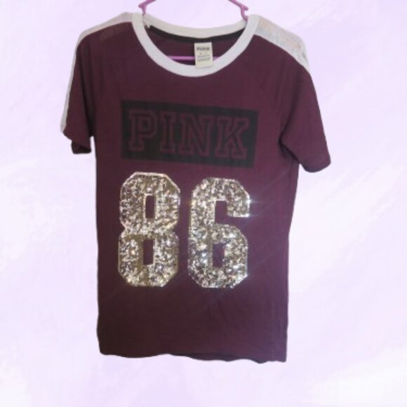 PINK Victoria's Secret outline pink sequined 86 t-shirt "pink" down sleeves in burgundy, gold and black size XS.