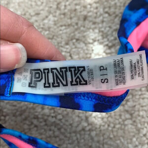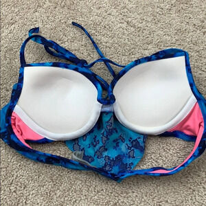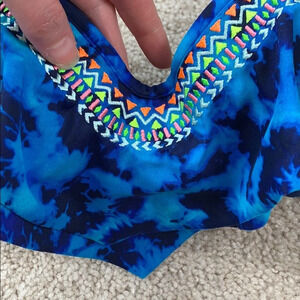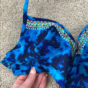 Excellent condition blue tie dye halter bikini top! Small amount of push up padding. Ruffled layered fabric with slightly longer length in middle.