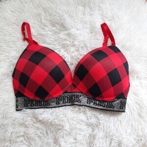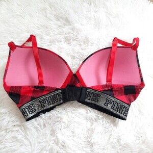 Excellent pre-owned condition red and black flannel plaid, limited edition wear everywhere pushup bra from Victoria's Secret PINK