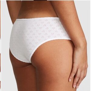 White pointelle cotton cheeky panty by PINK from Victoria's Secret. Your favorite just got cuter, Moderate coverage makes this pair a cheeky must-have, soft cotton pointelle fabric, low rise, heart pattern throughout, and brand new in packaging!