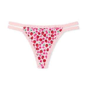 Strappy berry thong by PINK from Victoria's Secret. The perfect pair, but even cuter. A flirty essential that's comfy enough for daily wear, featuring a strappy band and barely-there coverage. Low rise, strappy bands at hips, supersoft lace with Forever Stretch technology, no back coverage, and a pink color pallet with a strawberry and cherry pattern throughout. Brand new in packaging!
