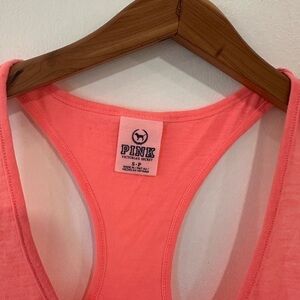 Women’s PINK Victoria Secret tank top + size small + racerback design + coral pink in color + older Y2K layering style + approx measurements, pit to pit: 14in & length: 27.5in + no flaws / good, used condition with light wear + ships from 100% smoke free home