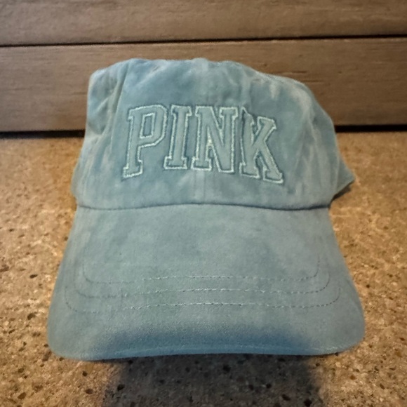 Never worn PINK baseball cap in the color blue. Has adjustable strap and velvet fabric!