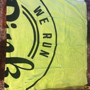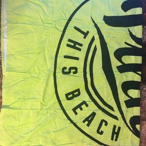 tote bag has the word pink written in black writing. The towel is 5ft in length has the words we run this beech in black with the word pink in the center