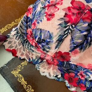 EUC is a floral lace push up bralette by Pink of Victoria Secret. This is the Euphoria style. Molded cups for push up and support, pull on style. Mesh center insert with high neck style.