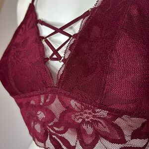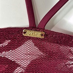 PINK by Victoria’s Secret Burgundy ( Merlot or wine color ) Corset Lace up Front Lightly Lined Strappy Bralette Bra Top size Small. Excellent condition. Very stretchy all over floral lace . Criss cross straps in back .. very sexy . Padded lined not see through cups so can also be worn as a crop top instead of for lingerie. Stretchy elastic band under bust for support but Wirefree | Wireless not underwire.