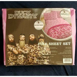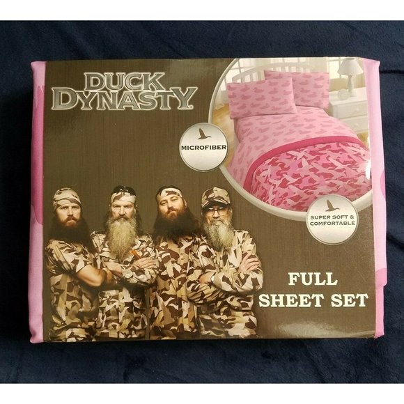 Check out this Duck Dynasty Pink camo full sheet set I have multiple if you want to deck out your whole house they are 100% Polyester includes one flat sheet 1 fitted sheet and two standard pillow cases ultra-soft Duck Dynasty family certified and redneck approved they're pink with pink duck camo pattern as any Duck Dynasty fan could appreciate check out my other items for other sizes and colors Microfiber