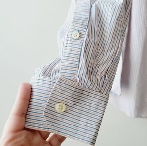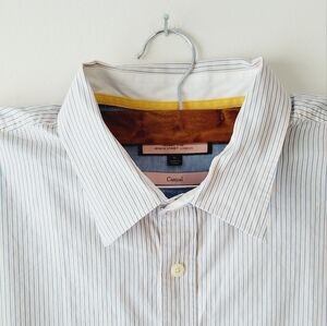 Great conditions men's shirt. No stains, rips or bad odors. Colors pink, blue and white. Blue embroidery brand on the side pocket. Collar neck. Button up for closure. Great for special events, work and more. formal or casual wear. Soft comfortable fresh fabric. Please see pictures for more details.