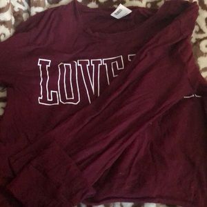 Burgundy Color with white lettering. Long sleeve crop top. Only worn and washed once hung to dry. The worn look on the neckline was intentionally sold that way. Super cute over a cami.