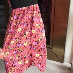 Super cute romper with black elastic waist band and jogger style detail on side of shorts. The spaghetti straps are adjustable. The overall length of the romper is 30 inches the length from the waist to the shorts is 12.5 inches waist unstretched is 26 inches inseam of the shorts is 3 inches. Perfect like new condition colors bright and pretty liberty floral print.