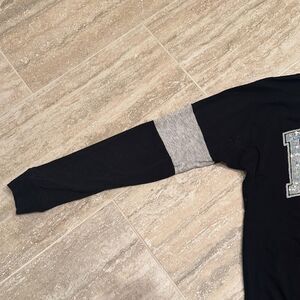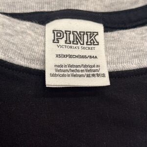 PINK Long sleeve, black and gray T-shirt with iridescent sequin lettering. 60%, cotton, 40% polyester, very soft fabric size extra small, but is loose fitting.