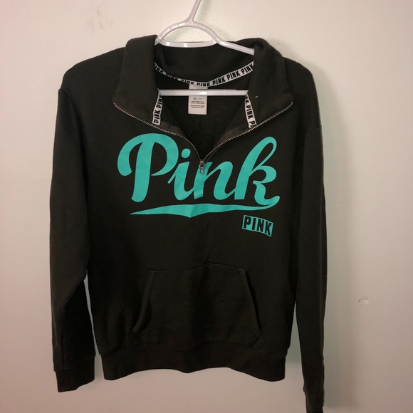 olive green pull over. bright blue lettering,silver zipper, and in good condition
