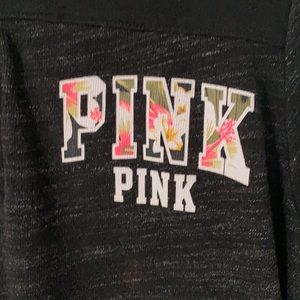 VS PINK pullover, gently worn has floral logo and hoodie pocket. Color is a heather black