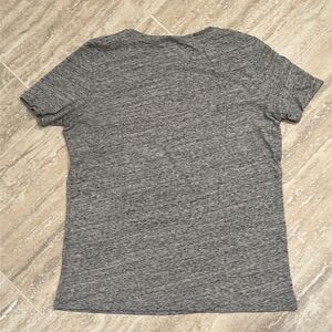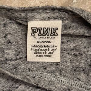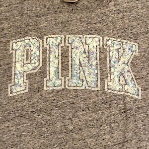 PINK short sleeve, heathered T-shirt with iridescent, sequin detail, slightly curved bottom. Size medium. 60%, cotton, 40% polyester.