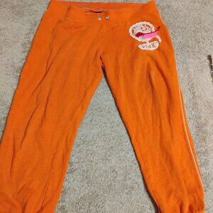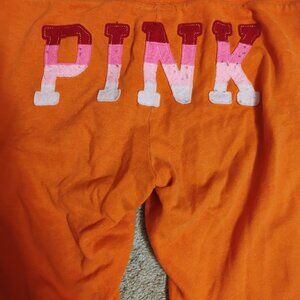 Stylish Orange Victoria Secret Sweatpants. Very comfortable and warm with the logo written across the back. Perfect for fall weather. Drawstrings are missing.