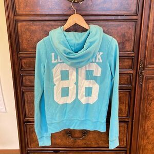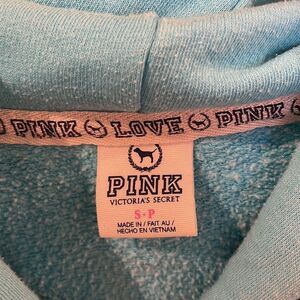 Pink woman’s light blue zip up hoodie. On the front of the sweatshirt it has a dog and on the back it says love pink 86. This sweatshirt is super cute and in really good condition. It’s a size Small.