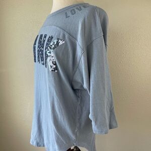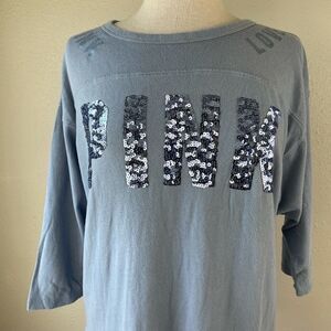 Classic t-shirt by PINK featuring a sparkly blue sequined and Love design. It measures 20 inches armpit to armpit and 26 inches from shoulder to hem.
