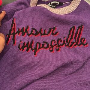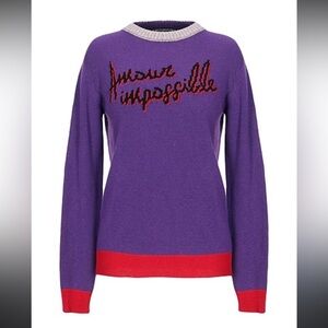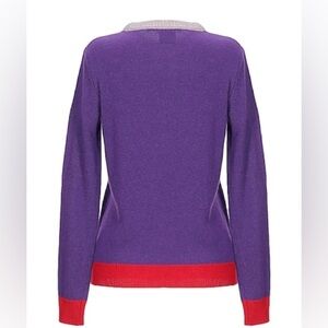 Stylish purple sweater featuring bold red accents. Perfect for adding a pop of color to your wardrobe.
