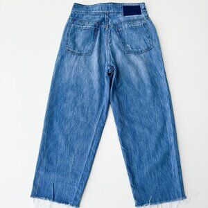 Faded denim high rise cropped jeans featuring small scrapings, belt and frayed hem.