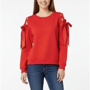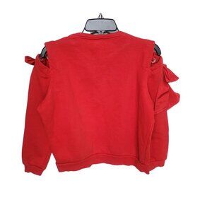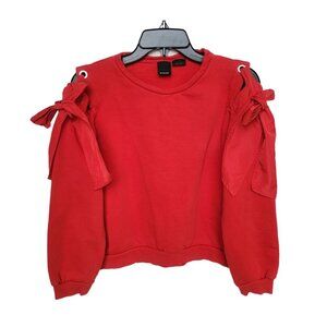 ❤️PINKO Sz S Petite Red Sweater Cold Shoulder Bow Tie Cutout Ribbons 100% Cotton