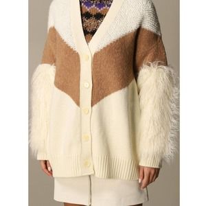 PINKO Wool Mohair Oversized Fur Sleeves Cardigan Cream Tan SZ:S