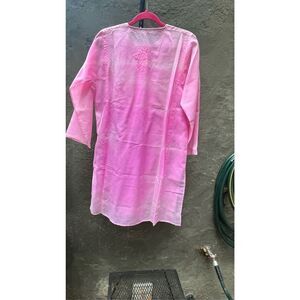 PINK TIE DYE SEMI SHEER COTTON CAFTAN COVERUP EMBROIDERED LONG KURTA TOP L/XL