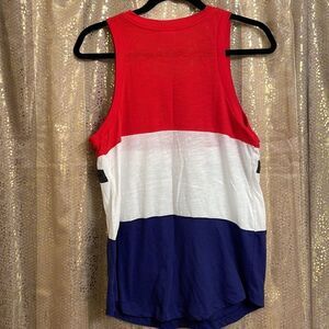 Smoke and pet free home. Pretty red, white and blue sequin bling tanktop. This would be cute for 4th of July! Sequins are silver and black. Size is S, but this is oversized, would fit a M, possibly a large. Good amount of stretch. Rounded bottom hem. Crosslisted.