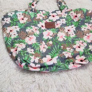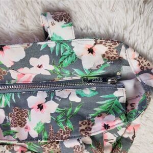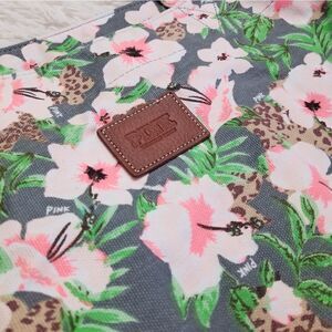 Tote bag. Gray background with pink flowers, green leaves, and some animal print patterns throughout. Silver zipper with the PINK logo that partly covers the open top of the bag. Inside the bag is a pocket. One side of the bag has a faux leather patch with the PINK logo.